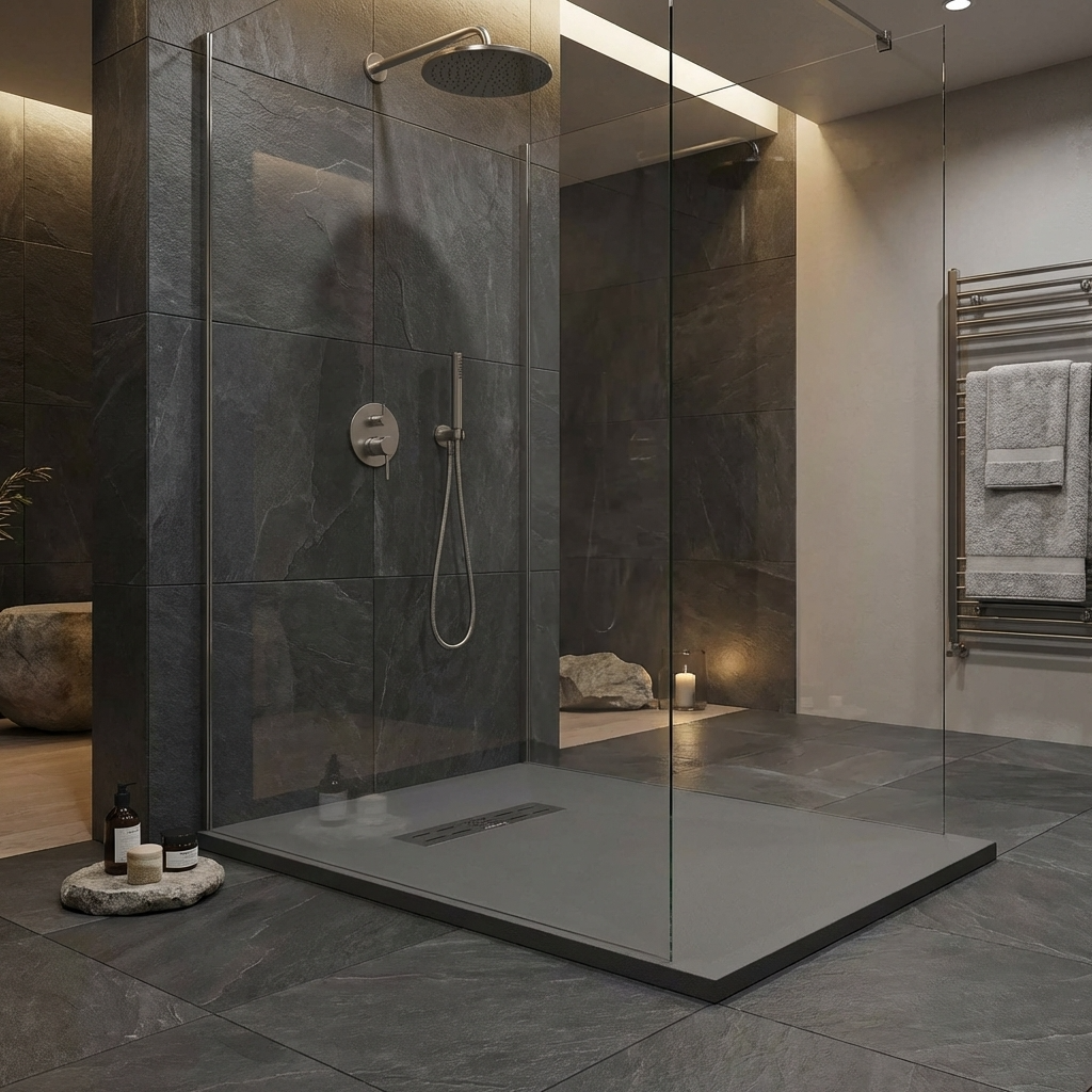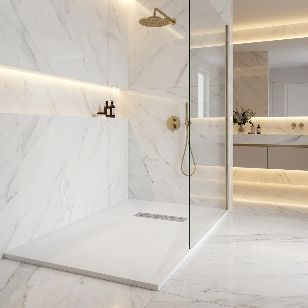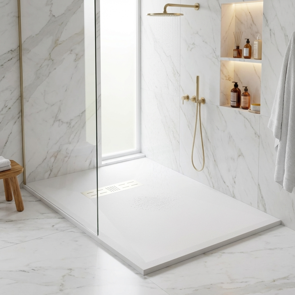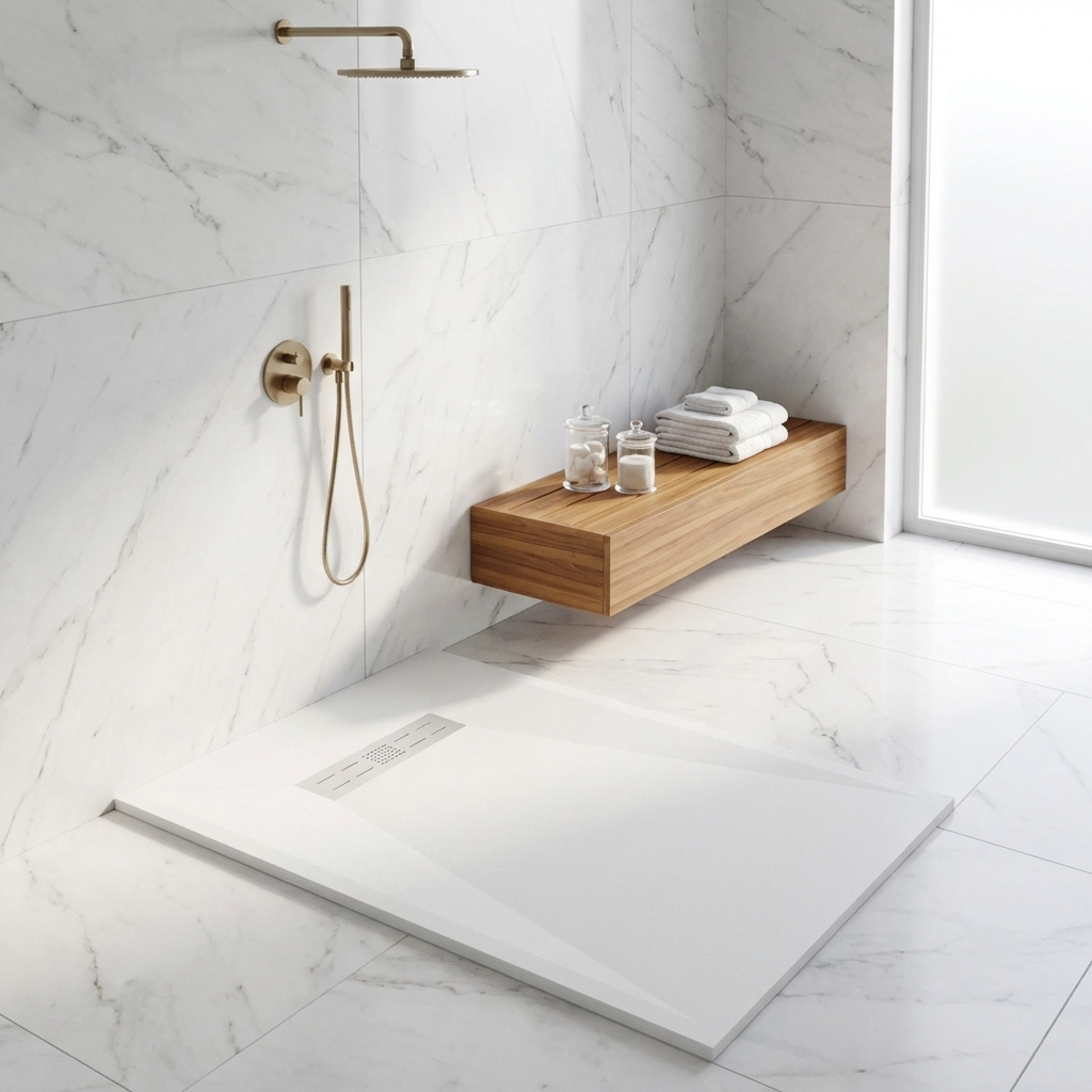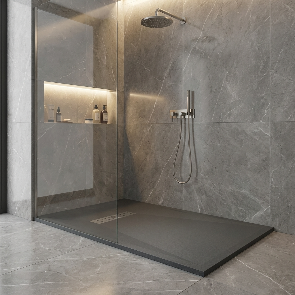 Extra flache Duschwannen aus Resina sind ideal für moderne Duschen und stellen die beste Alternative zu Duschwannen aus Acryl dar.