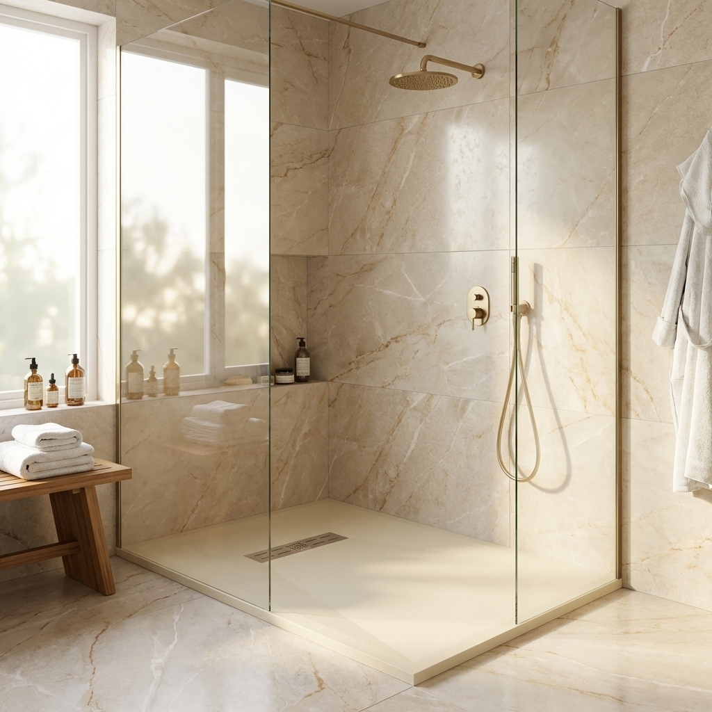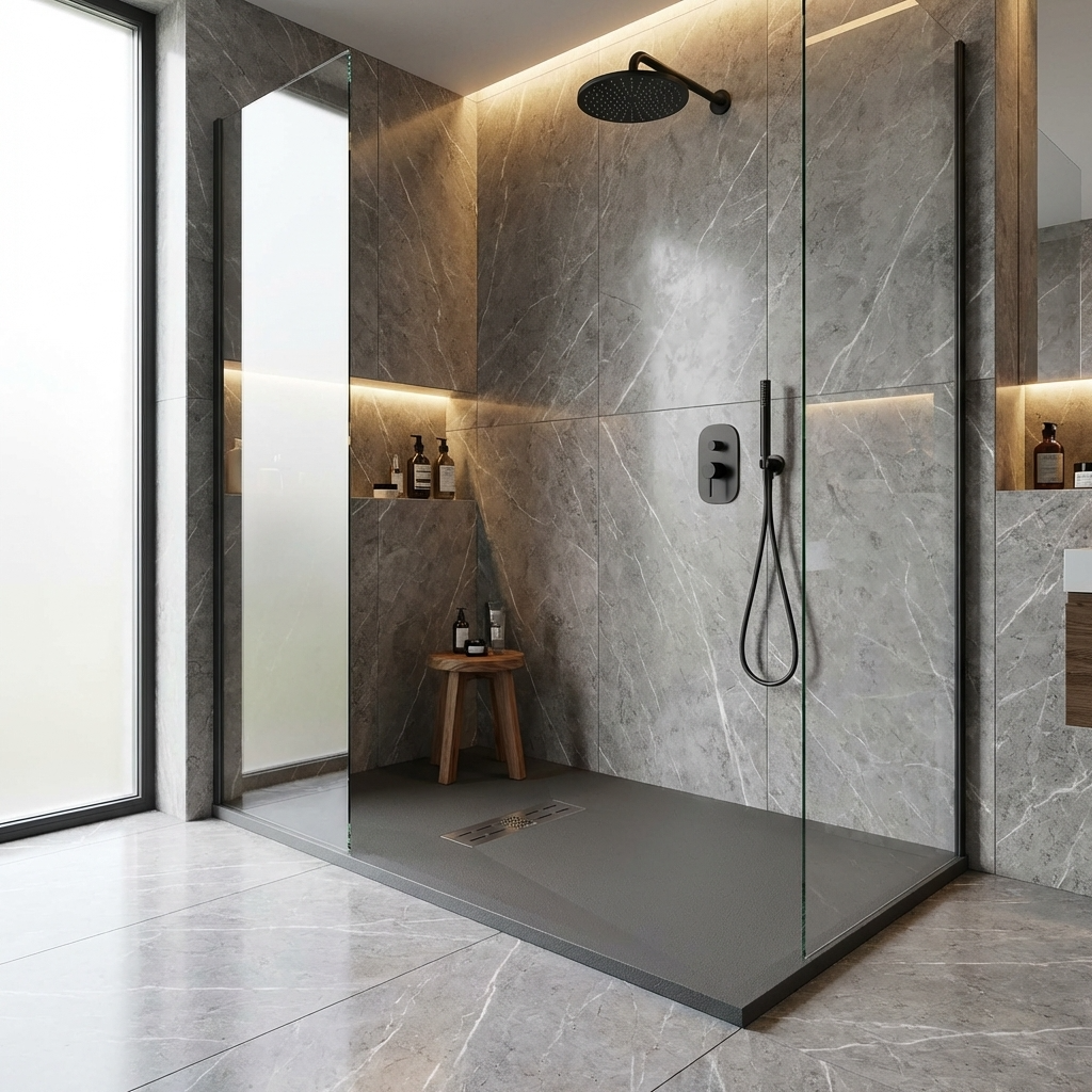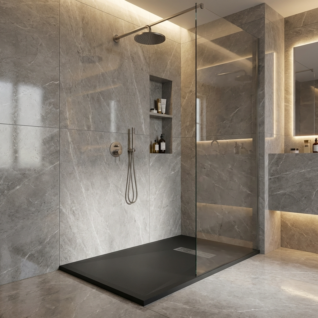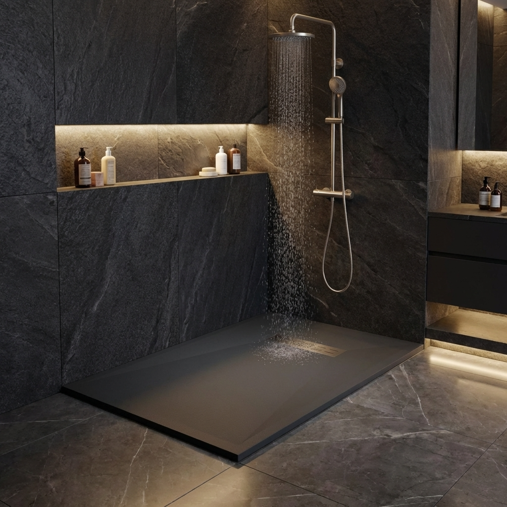 Extra flache Duschwannen aus Resina sind ideal für moderne Duschen und stellen die beste Alternative zu Duschwannen aus Acryl dar.