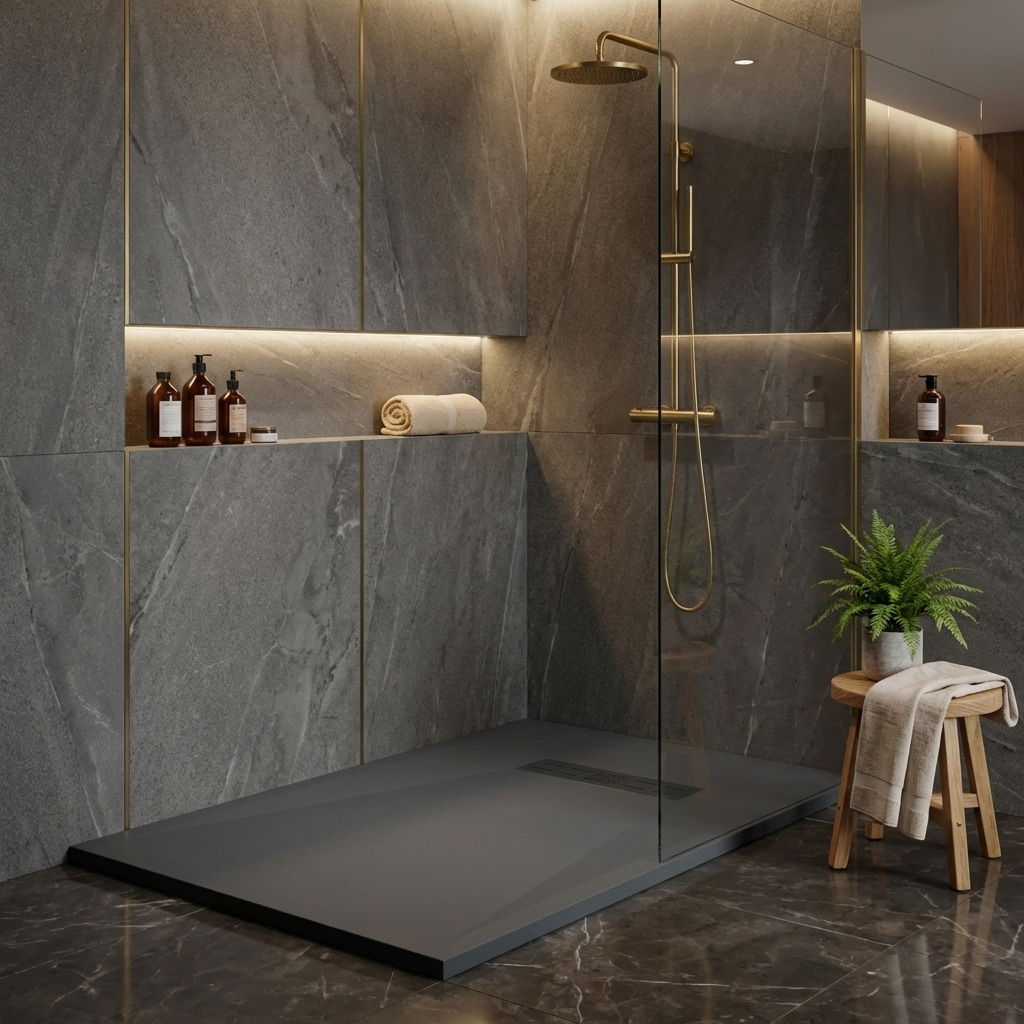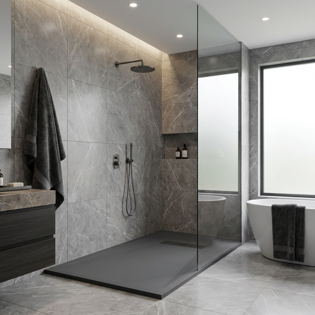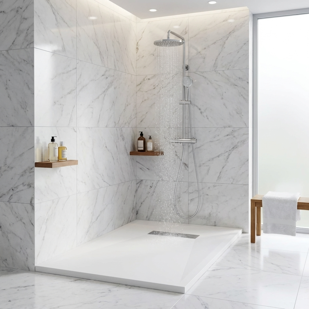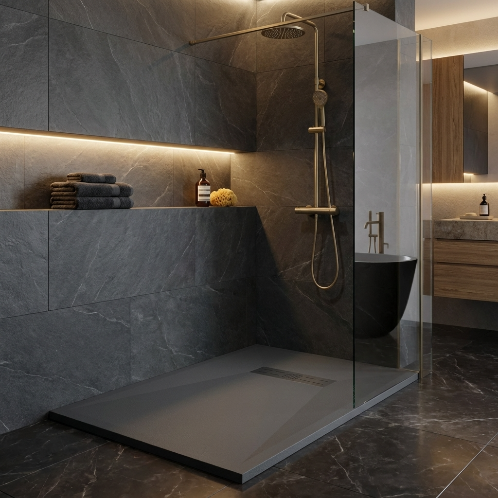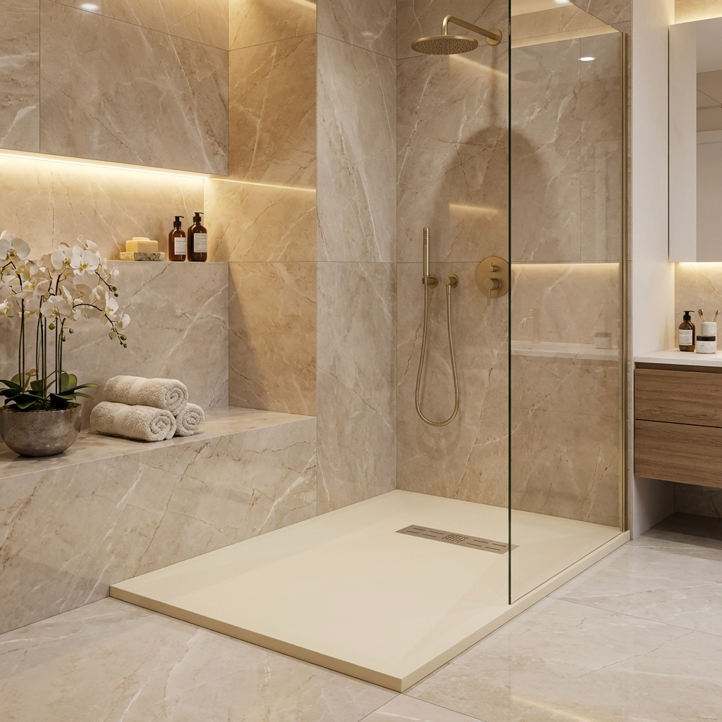 Extra flache Duschwannen aus Resina sind ideal für moderne Duschen und stellen die beste Alternative zu Duschwannen aus Acryl dar.
