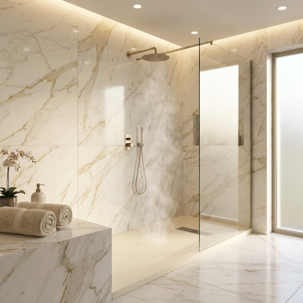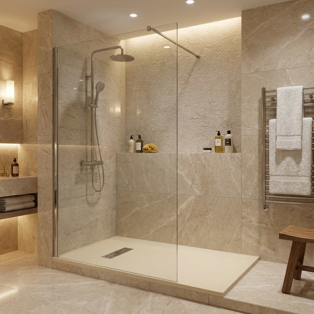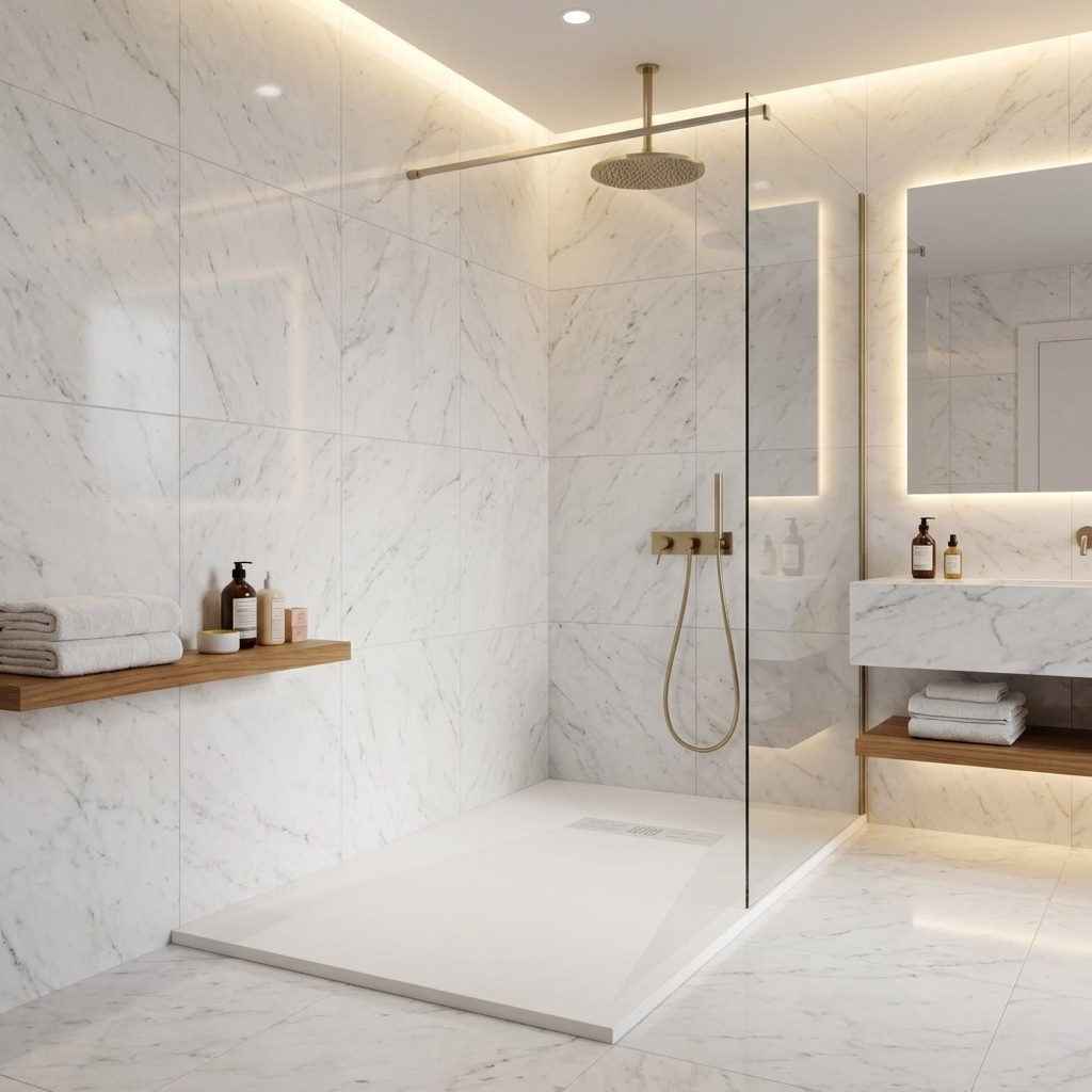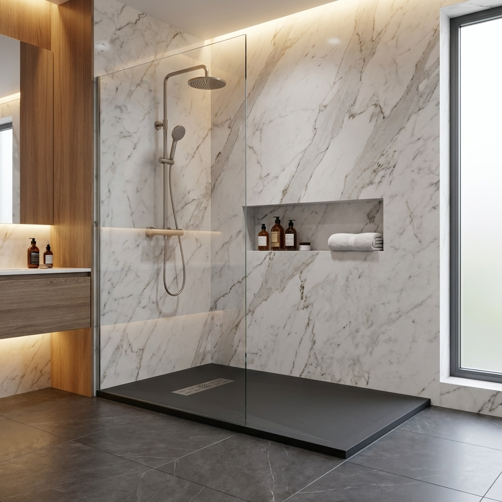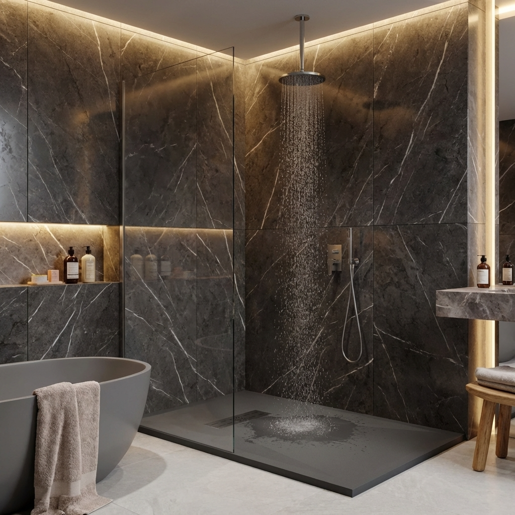 Extra flache Duschwannen aus Resina sind ideal für moderne Duschen und stellen die beste Alternative zu Duschwannen aus Acryl dar.