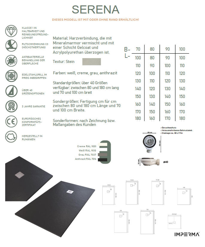 SERENA-Duschwanne aus Mineralguss inkl Abfluss !